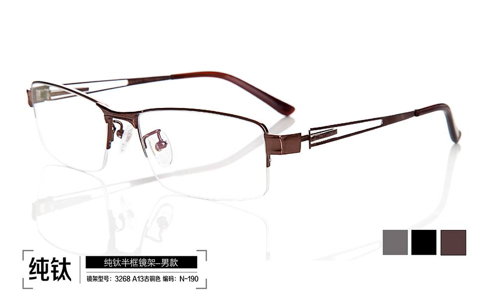 鏡架系列: 鈦金屬半框鏡架 名稱: 鈦金屬半框鏡架 型號:3268 A03灰色;3268 A04黑色;3268 A13古銅色 編號:N-188;N-189;N-190 |