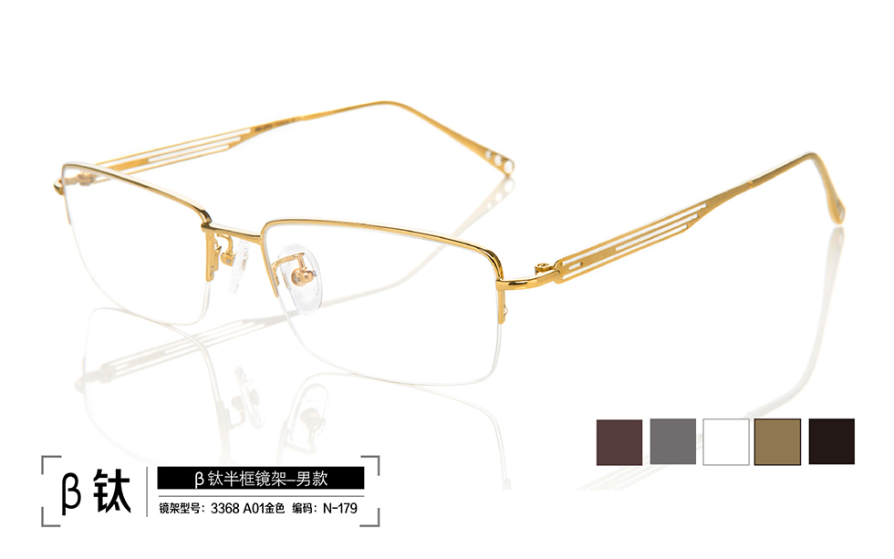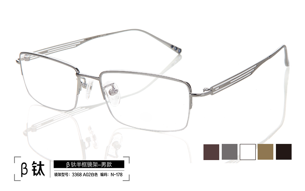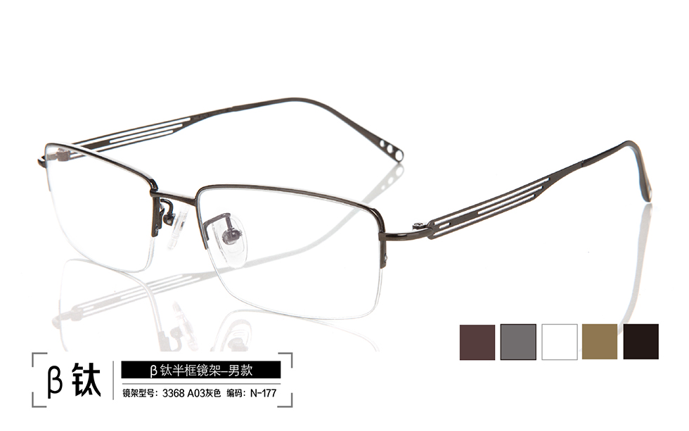 鏡架系列:β鈦半框鏡架 名稱(chēng):β鈦半框鏡架 型號(hào): 3368 A13 古銅色;3368 A03 灰色;3368 A02 白色;3368 A01 金色;3368 A04 黑色 編號(hào): N-168;N-177;N-178;N-179;N-180 |